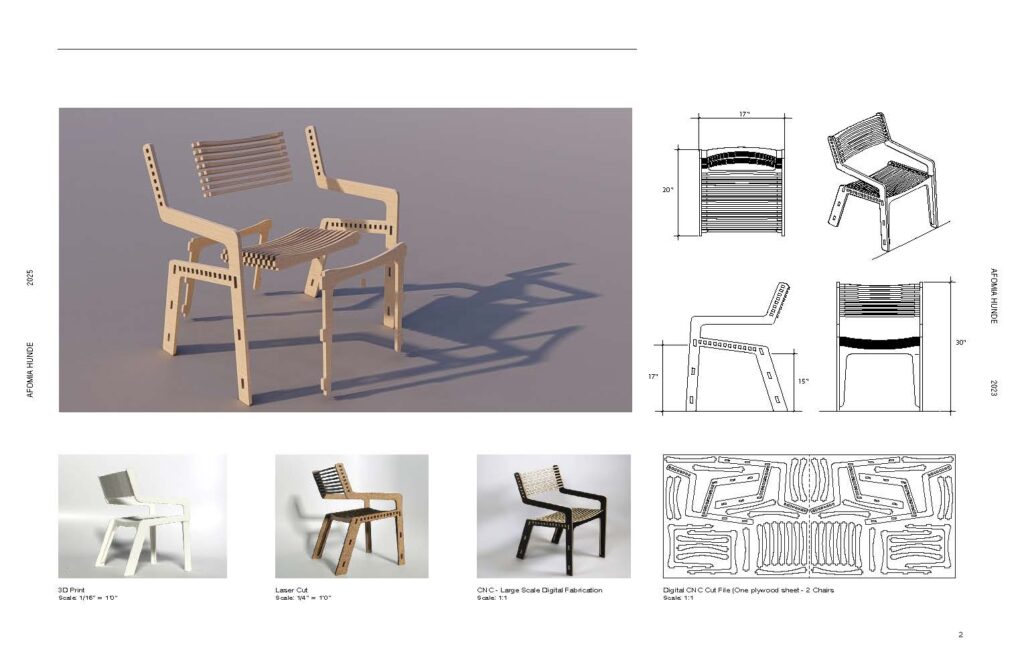 “This chair reinterprets Alvar Aalto’s cantilevered forms for contemporary global application, designed for lightweight efficiency and digital fabrication. Two chairs can be produced from a single 48”x96” plywood sheet, with modular Japanese joinery enabling flat-pack distribution, easy repair, and accessibility across contexts.