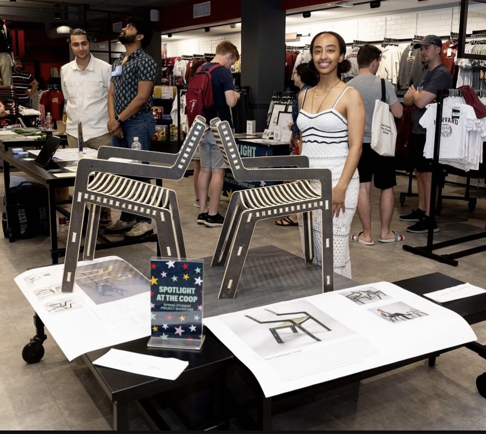 Crafted from locally sourced wood, its flowing curves embrace Kengo Kuma’s philosophy of mindful living while also drawing inspiration from Ethiopian traditions of adaptive building and community craft. By prioritizing waste reduction and replicable construction, the piece resists extractive models of design and instead honors ancestry, shared knowledge, and collective care. Recognized at both the Harvard Coop and MIT Coop, the work reflects a pursuit of functionality and creativity while envisioning furniture as both an artifact of cultural continuity and a tool for resilient, equitable futures.”